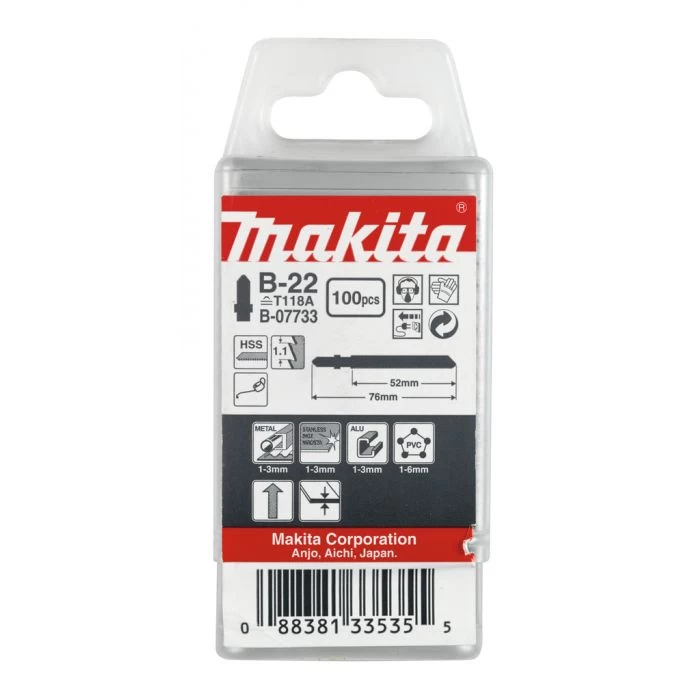 Extra informatie EAN barcode0088381335355 Past op4327,4329K,4350CT,4350FCTJ,4350T,4351CT,4351FCTJ,4351T,DJV141ZJ,DJV142ZJ,DJV180Z,DJV180ZJ,DJV181ZJ,DJV182RTJ,DJV182Z,DJV182ZJ,DJV184Z,JR1000FTK,JR105DZJ,JV0600K Stuks per verpakking100 MateriaalHSS [High Speed Steel] Tandafstand1,1 mm Aantal tanden per inch24 tpi Modelnr.B-22 Aluminium1 – 3 mm T. equivalentT118A RVS1 – 3 mm