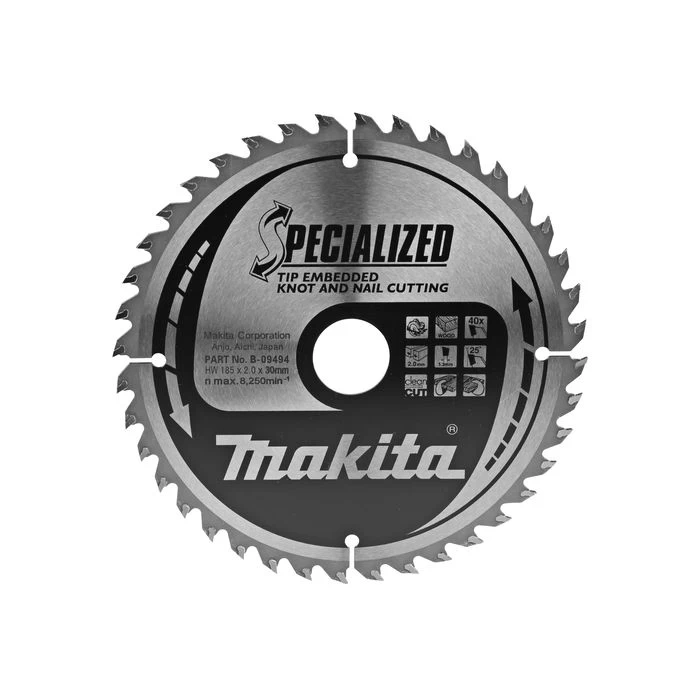 Extra informatie EAN barcode0088381337533 Past opHS7101K,HS7601J Stuks per verpakking1 Aantal tanden40 VertandingATB Tand dikte2,0 mm Tand Hoek25 º Max. toerental8250 min-1 Hout met spijkers28 mm Diameter zaagblad185 mm