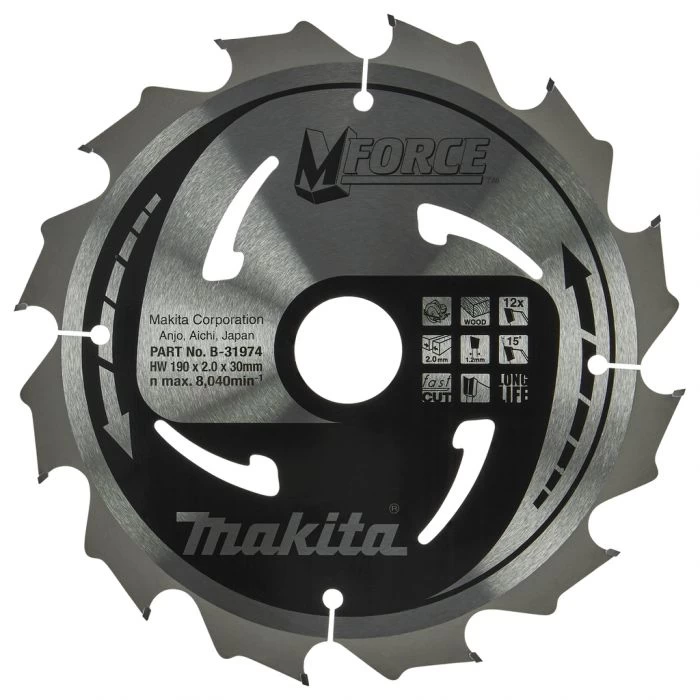 Extra informatie EAN barcode0088381420785 Stuks per verpakking1 Aantal tanden12 VertandingM-Force Tand dikte2,0 mm Tand Hoek15 º Max. toerental8040 min-1 Diameter zaagblad190 mm
