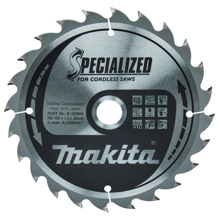 Extra informatie EAN barcode0088381421713 Stuks per verpakking1 Aantal tanden24 Tand dikte1,5 mm Tand Hoek20 º Max. toerental6500 min-1 Diameter zaagblad165 mm