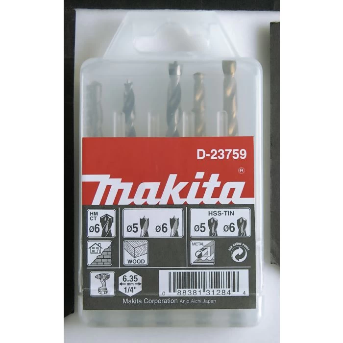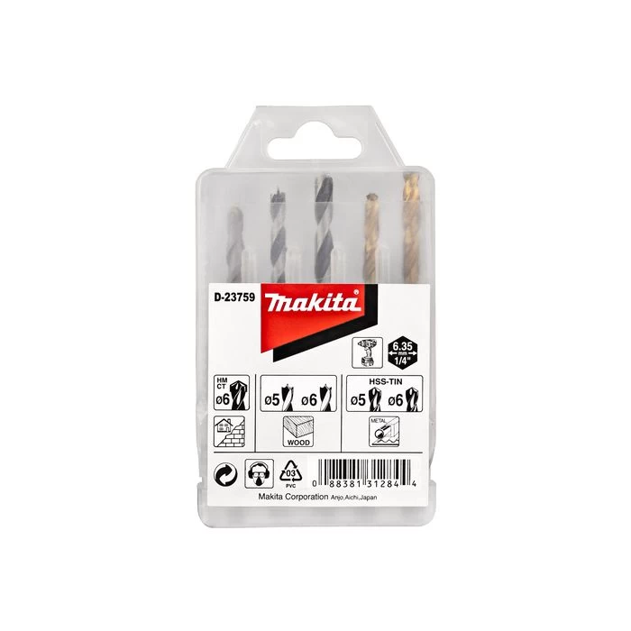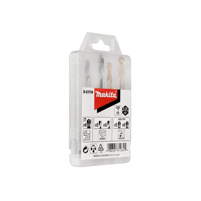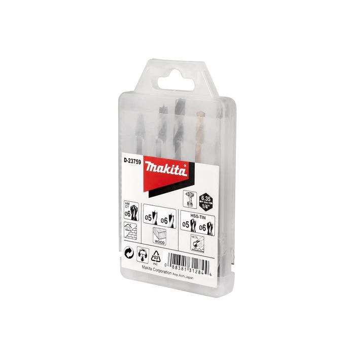 Inhoud: steenboor 6 mm, houtboren 5, 6 mm, metaalboren 5, 6 mm.
