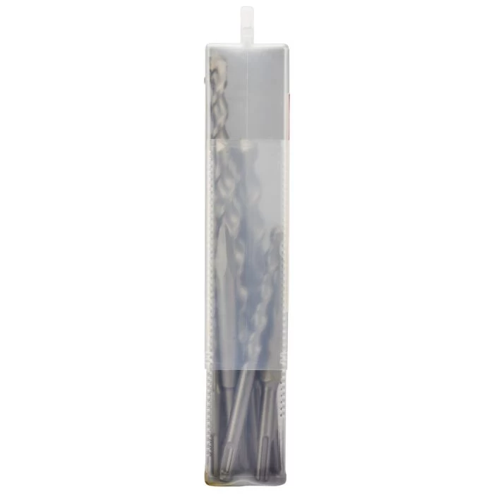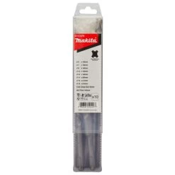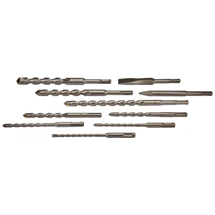 10-delige set met SDS-PLUS aansluiting, bestaand uit: betonboren lengte 160mm (6 – 7 – 8 – 10 – 12) betonboren lengte 210mm (16 – 18) betonboor 260mm (14) puntbeitel 160mm koudbeitel 20x140mm