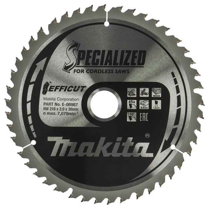 Extra informatie EAN barcode0088381570732 Stuks per verpakking1 Aantal tanden45 VertandingEfficut ATBR Tand dikte2,0 mm Tand Hoek10 º Max. toerental7070 min-1 Diameter zaagblad216 mm