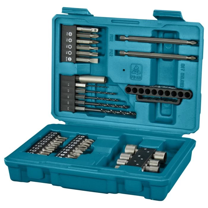 42-delige Makita boor-/schroefbitset met diverse maten metaalboren, schroefbits en doppen.