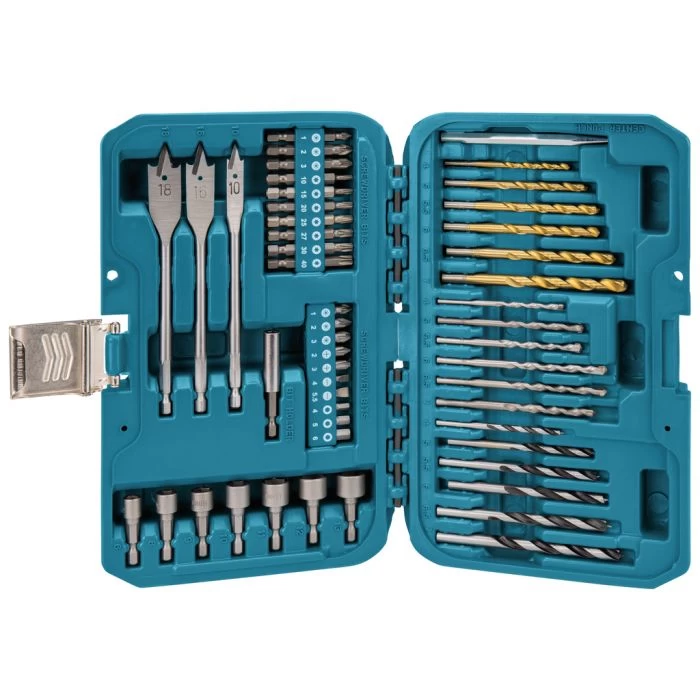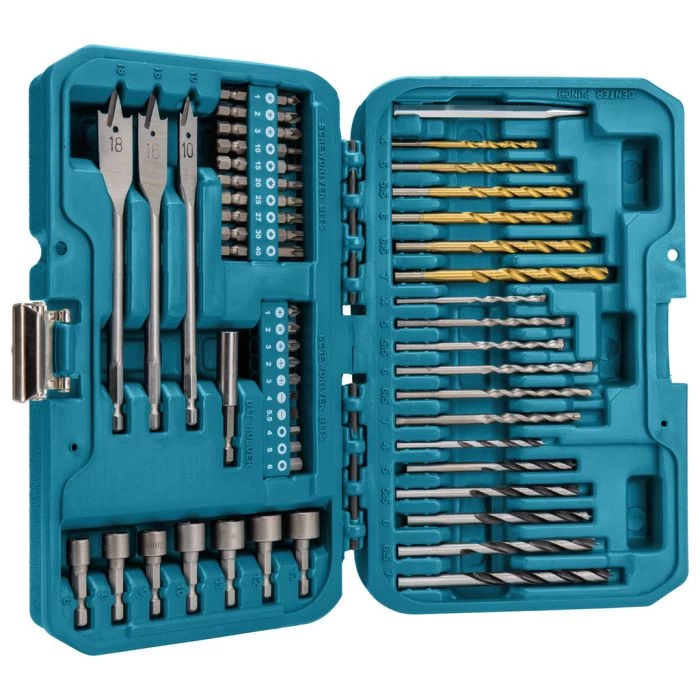 50-delige boor-/schroefbitset in kunststof koffer bestaande uit 18-delige spiraalboorset, 23-delige schroefbitset, 7-delige doppenset en 2 diversen.
