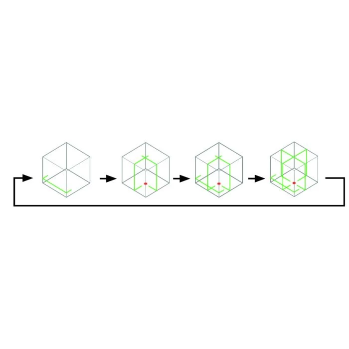 Vier laserlijn selecties: horizontaal, dubbel verticaal, horizontaal met dubbel verticaal en horizontaal met viermaal verticaal.